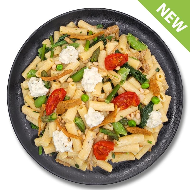 Chicken, Macaroni, a blend of Leaf Spinach, Broccoli, Sugar Snaps, Green Asparagus and Garlic Scapes, Oven-Dried Tomatoes, Pine Nuts and Sauce