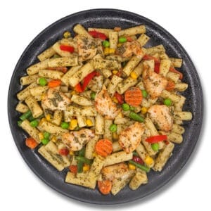 548 kcal | 43,3g eiwit | 49,5g koolhydraten | 18,6g vet Kip, Pasta,...