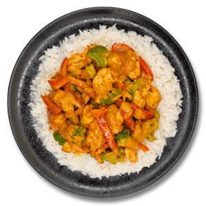 521 kcal | 42,1g eiwit | 53,3g koolhydraten | 14,3g vet Kip, Gele ri...